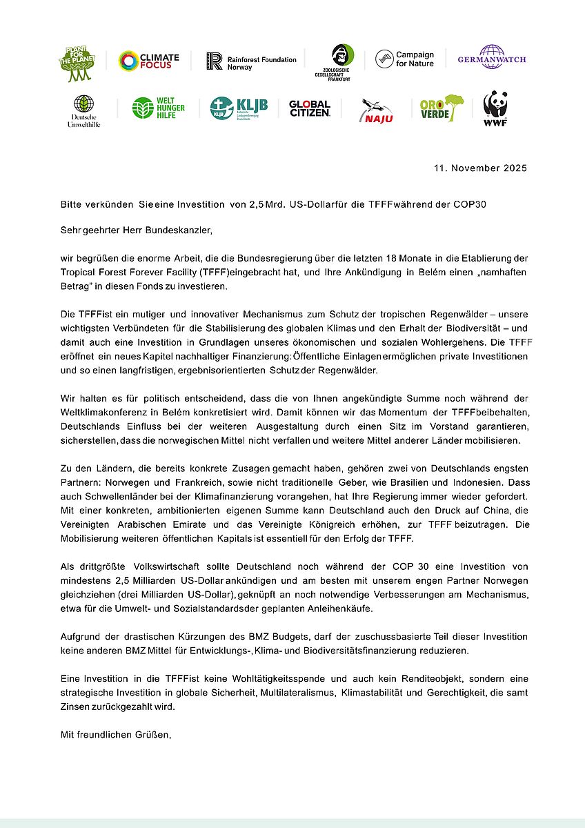 Ein breites Bündnis aus Umwelt-, Entwicklungs- und Klimaschutzorganisationen fordert die Bundesregierung während der COP 30 in Belém auf, eine Investition von 2,5 Milliarden US-Dollar in die Tropical Forest Forever Facility (TFFF) zuzusagen.