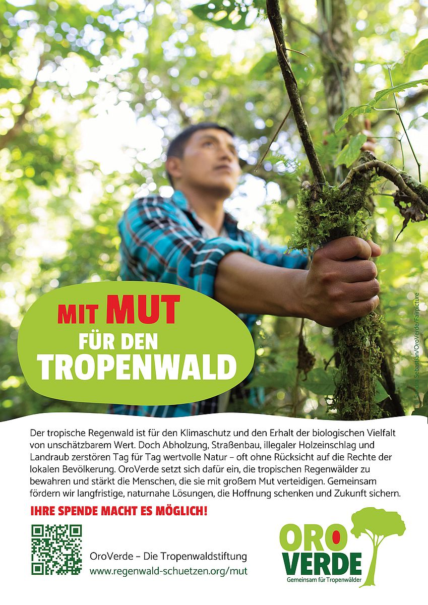 "Der tropische Regenwald ist für den Klimaschutz und den Erhalt der biologischen Vielfalt von unschätzbarem Wert. Doch Abholzung, Straßenbau, illegaler Holzeinschlag und Landraub zerstören Tag für Tag wertvolle Natur – oft ohne Rücksicht auf die Rechte der lokalen Bevölkerung. OroVerde setzt sich dafür ein, die tropischen Regenwälder zu bewahren und stärkt die Menschen, die sie mit großem Mut verteidigen. Gemeinsam fördern wir langfristige, naturnahe Lösungen, die Hoffnung schenken und Zukunft sichern."