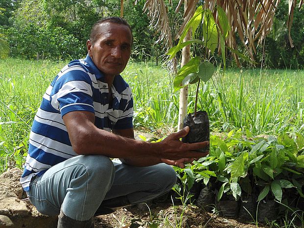 Fotonachweis: FDN (Header), Sabine Merle (Mann mit Setzling), OroVerde (Agroforst mit Mann, Brüllaffe, ein Mödchen mit Setzling, Gruppe mit Früchten, Echse im Regenwald), Centro Naturleza ( 2 Mädchen mit Setzling), Heifer (Mann mit zwei Setzlingen).