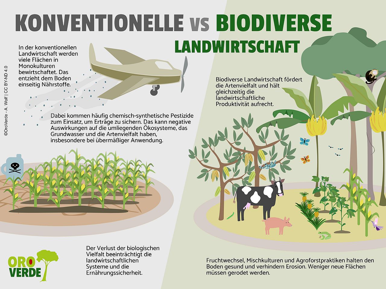 Fast 90 Prozent der weltweiten Waldzerstörung sind auf die Ausweitung von landwirtschaftlichen Nutzflächen zurückzuführen. Damit trägt die konventionelle Landwirtschaft maßgeblich zum Verlust der wertvollen weltweiten Biodiversität bei. Für Weideflächen und Plantagen müssen jedes Jahr riesige Flächen einzigartiger Ökosysteme wie tropische Wälder und deren Biodiversität weichen. Die Produktion von Fleisch, Palmöl, Soja oder Kaffee ist direkt verknüpft mit dem Biodiversitätsverlust in tropischen Gebieten.