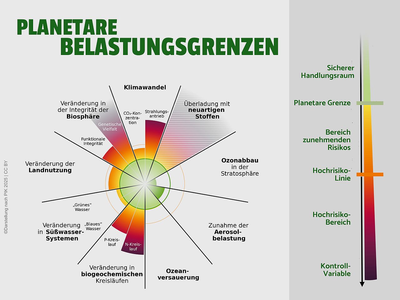Die Infografik zu den Planetaren Belastungsgrenzen orientiert sich an Veröffentlichungen des Potsdamer-Institut für Klimafolgenforschung.