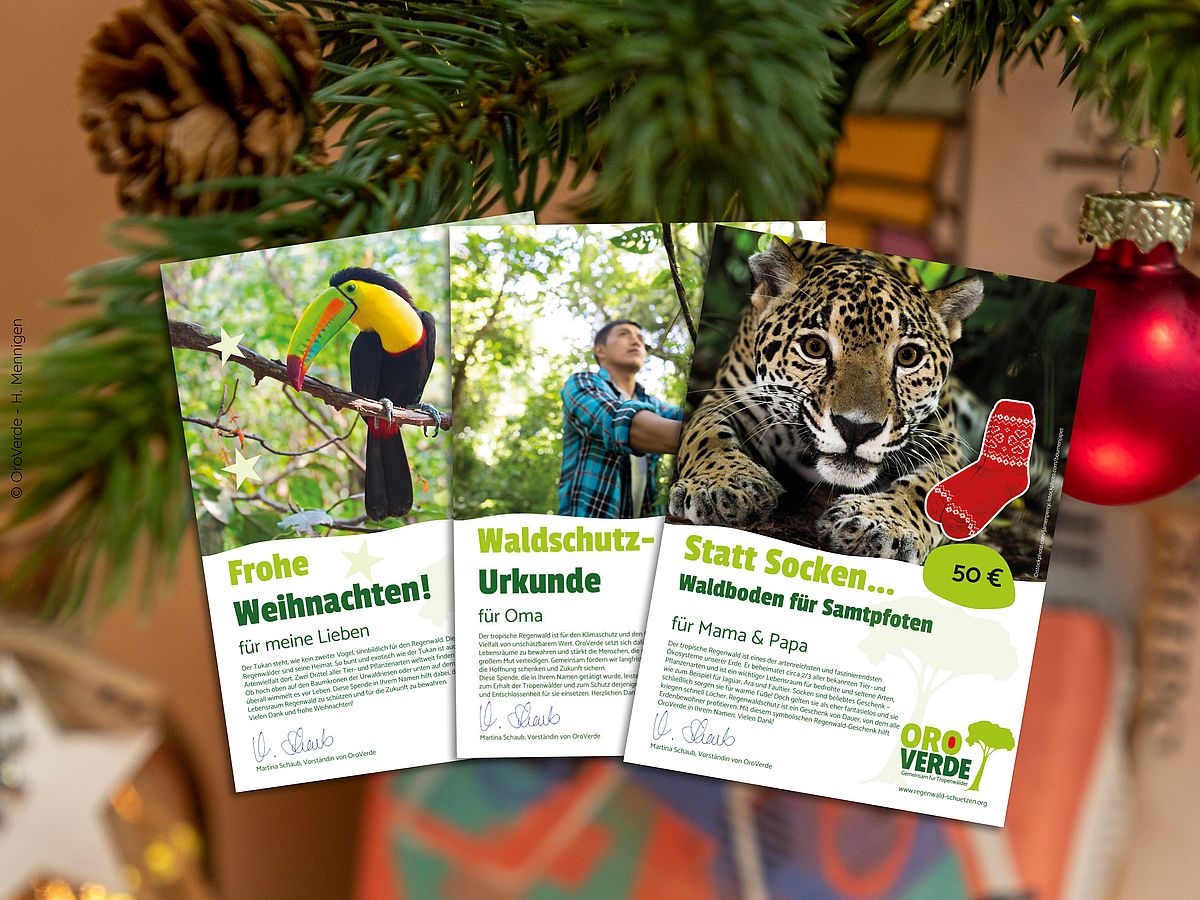 Dann verschenken Sie doch Regenwaldschutz im Namen Ihrer Lieben mit einer Geschenkurkunde! Jede Urkunde können Sie bei der Bestellung mit einer persönlichen Widmung versehen und erhalten sofort einen Downloadlink zu Ihrem persönlichen Weihnachtsgeschenk, dass Sie sich bequem zuhause ausdrucken oder einfach digital verschenken können. Ihre Spende im Namen des Beschenkten fließt in die Regenwaldschutzprojekte von OroVerde und ist zudem für Sie steuerlich absetzbar.